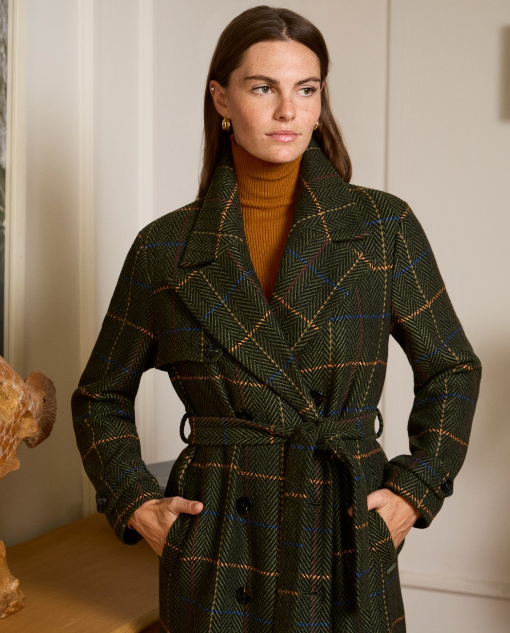 Abrigo estilo trench con tejido de espiga. Kaki
